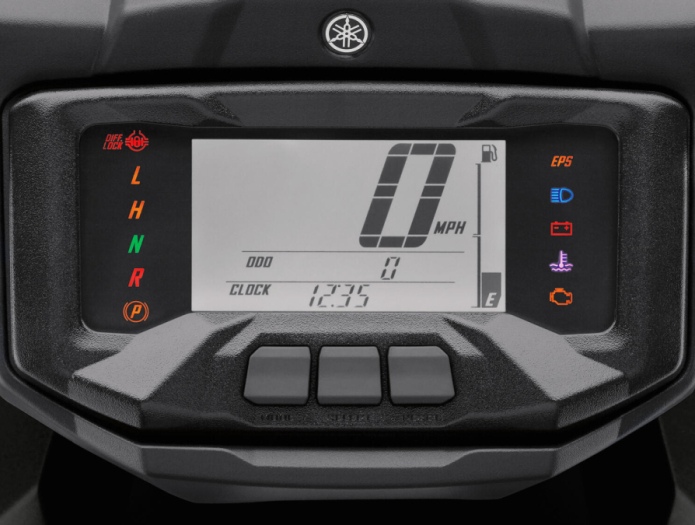 Многофункциональный цифровой дисплей Grizzly 700 EPS включает указатель уровня топлива, спидометр, одометр, счетчик моточасов, часы, предупреждение о блокировке полного привода/дифференциала, положение передачи и сигнальную лампу EPS. Есть три отдельных отсека для хранения, в которых достаточно места для инструментов или личных вещей.